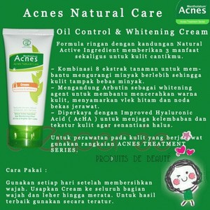 Acnes Natural Care Oil Control Whitening Cream. Kombinasi 8 extract tanaman membantu mengurangi minyak berlebih sehingga kulit tampak bebas minyak seketika.