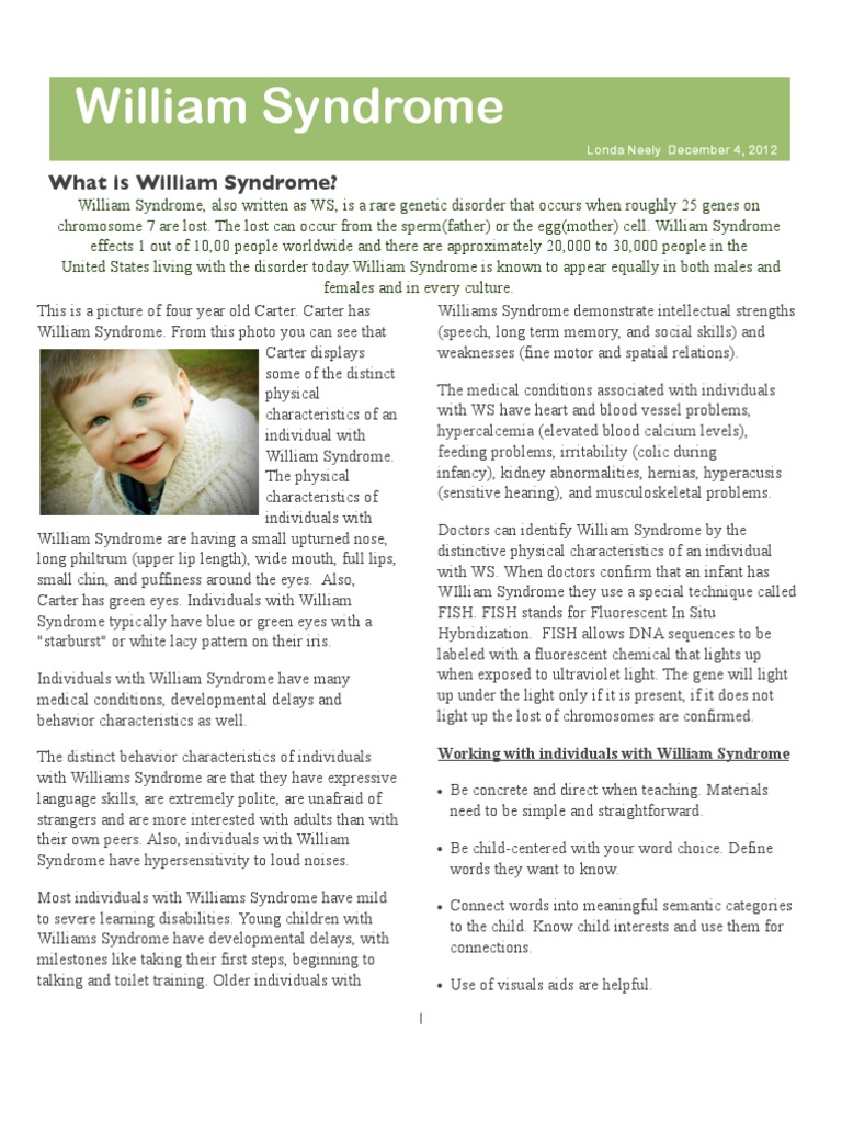 Williams syndrome WS is a genetic disease with a relatively homogeneous profile. These often occur side by side with striking verbal abilities highly social personalities and an affinity for music. Such claims have in turn been interpreted as evidence either for modular preservation of language or for atypical constraints on cognitive development.