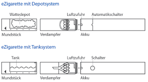 Der Aufbau der E-Zigaretten besteht im Wesentlichen aus drei Teilen.